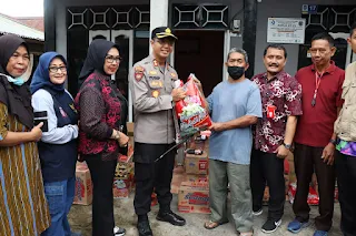 Bontang - Kapolres Bontang AKBP Yusep Dwi Prastiya, S.H., S.I.K., M.H., beserta Wakil Walikota Bontang Hj. Najirah, S.E. dan rombongan meninjau lokasi dan menyerahkan bantuan sosial kepada masyarakat terdampak Bencana Alam Tanah Longsor, Jumat (24/2/2023).